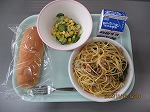 和風スパゲッティのきのこは、しめじ・えのきを使用しています。ほうれん草やにんじん、玉ねぎに、ベーコンや豚肉も加えて栄養のバランスを整え、しょうゆとかつお節で味付けしています。ごまドレッシングサラダは、キャベツ、きゅうり、コーンをドレッシングで和えて甘味がきいた味付けです。