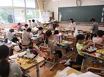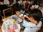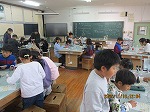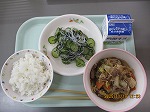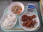春雨汁は、白菜、にんじん、干し椎茸に、鶏肉やはんぺんを加えています。本校は自校給食なので、汁物は温かさが保たれたまま、いただくことができます。揚げ里芋の肉みそがらめは、里芋にでんぷんをまぶして油で揚げています。肉みそを炒めて作り、その中に揚げた里芋を加えています。甘辛いみそに里芋が絡んで食べやすくなっています。