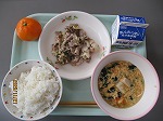 今日の給食は、すべて長崎県産の食材を使った給食です。かきたま汁は、玉ねぎ・にんじん・えのき・ほうれん草といった野菜類がたくさん入っています。豚肉のねぎ塩炒めは、レモン果汁を加えて、ご飯が進む味付けとなっています。お米・みかんは長与町で採れた食材です。