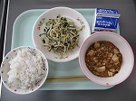 麻婆豆腐は、中華料理の代表的なメニューです。給食では豆板醤を使って少しだけ辛みを付けています。ご飯にかけて、麻婆丼にしてもおいしいです。もやしとハムの炒めものは、ニラも加えて、さっぱりした味付けに仕上がっています。
