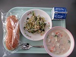 先日は秋野菜のカレーでしたが、今週から季節は冬となり、冬野菜を具材にしたシチューとなっています。今が旬のかぶ、ブロッコリー、にんじんといった冬野菜がたくさん入っています。アーモンドサラダはキャベツ、ほうれん草と和えて甘すっぱい味付けになっています。
