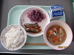 煮物には、鶏肉つくねと大豆に加えて、大根、じゃがいも、にんじん、こんにゃく、インゲンも入っていて、肉じゃが風の仕上がりです。ひょっつるは、わかめの葉をゼリー状加工して細麺にしたヘルシーな食品です。もやしと和えて甘酸っぱく仕上げています。今日のご飯は、キムタクご飯です。キムチ・豚肉・たくあんを加えていて食が進みます。