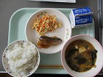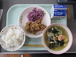 つみれ汁は、わかめや小松菜、油揚げも入った温かい汁物です。昨日に続いて大豆が納豆みそで登場しています。食べやすいひきわり納豆を使って甘めに仕上げているので、苦手の子も食べやすいです。大根のゆかり酢は甘酸っぱい味に仕上がっています。