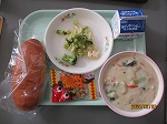 チンゲン菜のクリームシチューはチーズやバター、小麦粉が使われていて、まろやかな味わいです。花野菜のサラダは、カリフラワーやブロッコリーを甘めの手作りごまドレッシングで仕上げています。今日は節分にちなんで大豆まめが付いています。