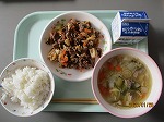 「ひかど」とは長崎の郷土料理で「ものを細かく刻む」という意味のポルトガル語が名前の由来です。今回の給食では、ヤズ、豚肉、大根、にんじん、深ねぎ、さつまいもを細かく刻み、とろみをつけて煮込んでいます。長崎はもともと砂糖が手に入りやすかったため、甘味の味付けが特徴の料理が多い地域です。焼肉炒めは野菜類と牛肉を赤みそのきいた味付けて炒めていて、ご飯が進みました。