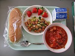 ボルシチは、ウクライナの料理で世界遺産にも登録されています。赤い色は、ビーツという株に似た野菜の色です。給食には食べやすいようにトマトも入っています。隠し味で生クリームも入っています。ウインナーと野菜のソテーは、ブロッコリーと玉ねぎを加えて、栄養のバランスを調えています。