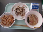 11月8日は「いい歯の日」です。白玉汁に入っている白玉もち、長与そぼろに入っているごぼうやもやしなど、しっかり噛んで食べることが大切な食材が入っています。今日は、秋が旬の食材である、栗が入った栗ごはんも提供されています。