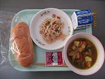 カレーうま煮は、色とりどりの野菜と、豚肉、じゃがいもを加えて煮込んでいます。カレー味にすることで、苦手な子どもにも食べやすい味付けとなってます。れんこんは、これから冬にかけて旬の食材です。煮物はもちろん、今回のメニューのように、枝豆とベーコンと一緒に炒めて食べても食感を楽しめます。