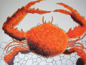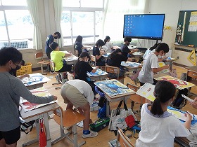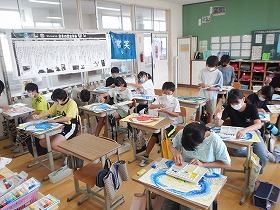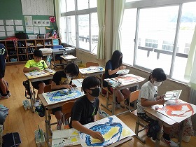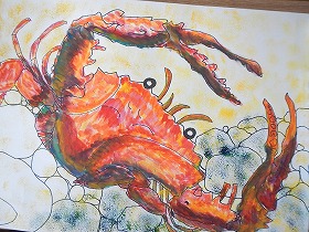「カニの特ちょうをつかみ、形や色を考えながら、工夫して表そう」というめあてで取り組んでいます。