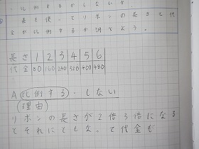 「表を使って、リボンの長さと代金が比例するか調べよう」というめあてで学びました。