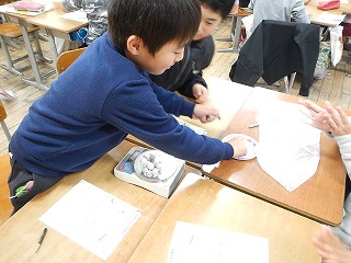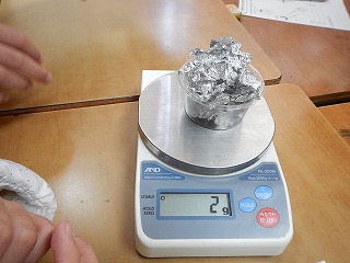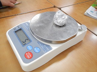 形を変えると物の重さは変わるかを、考えました。粘土とアルミ箔を使って、実験を行いました。