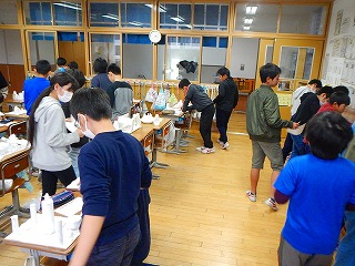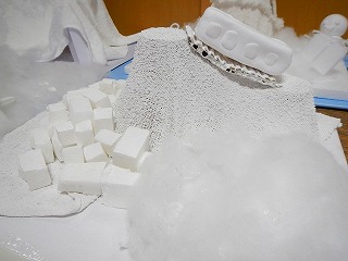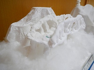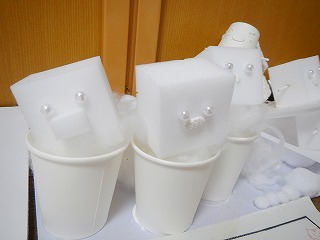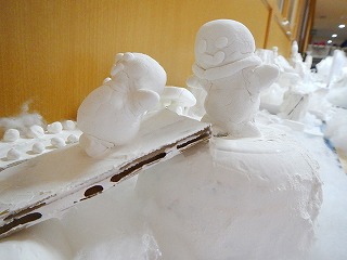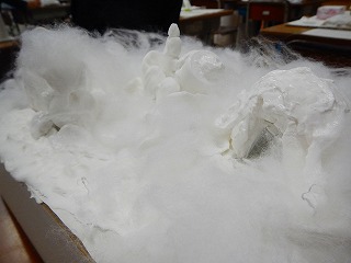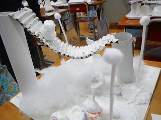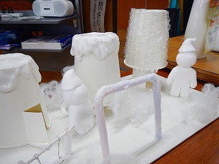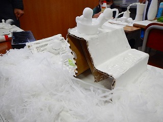 紙粘土や液体粘土や塗料を使って、白の世界を創りました。