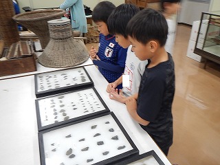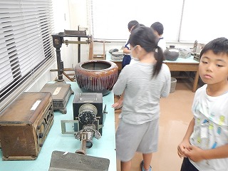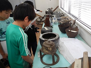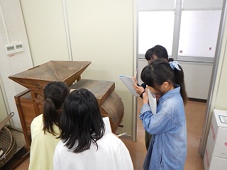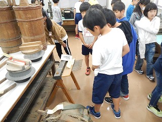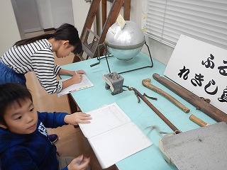 長与朝の図書館の3階に、昔の道具の見学に行きました。電気がなかった頃の道具の違いに驚いていました。
