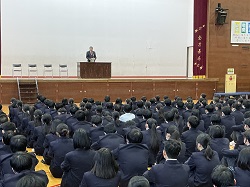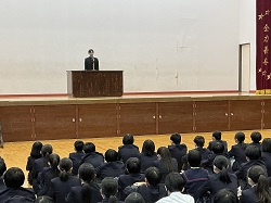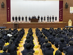 旧現生徒会役員のあいさつの後、生徒会旗の引き継ぎを行いました。